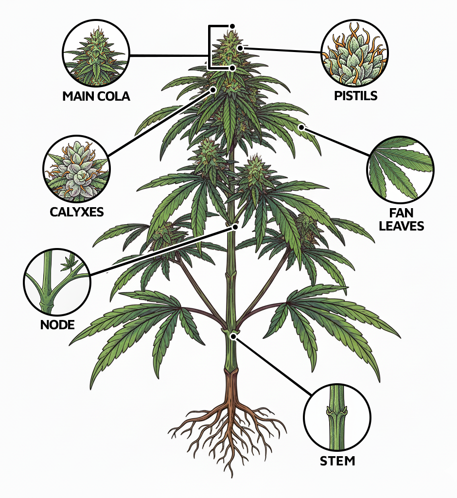 A marijuana plant is made up of a few key parts that give it its signature look. At the top, you’ll usually find the main cola, which is the big cluster of buds sitting like a crown on the plant. Along the sides are smaller colas growing from the branches. The branches connect at nodes, and each node can sprout new growth.