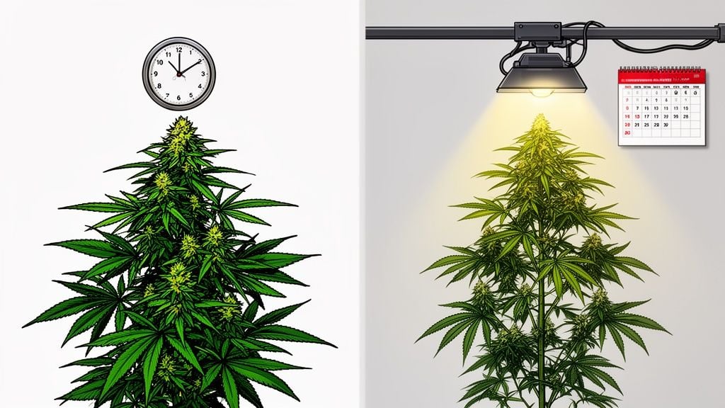 When you’re trying to decide between autoflower vs feminized seeds, the choice really comes down to speed versus control. Think of it this way: autoflowers are the sprinters—they race to the finish line on their own internal clock, no matter what you do with the lights. This makes them fantastic for beginners or anyone needing a quick turnaround.