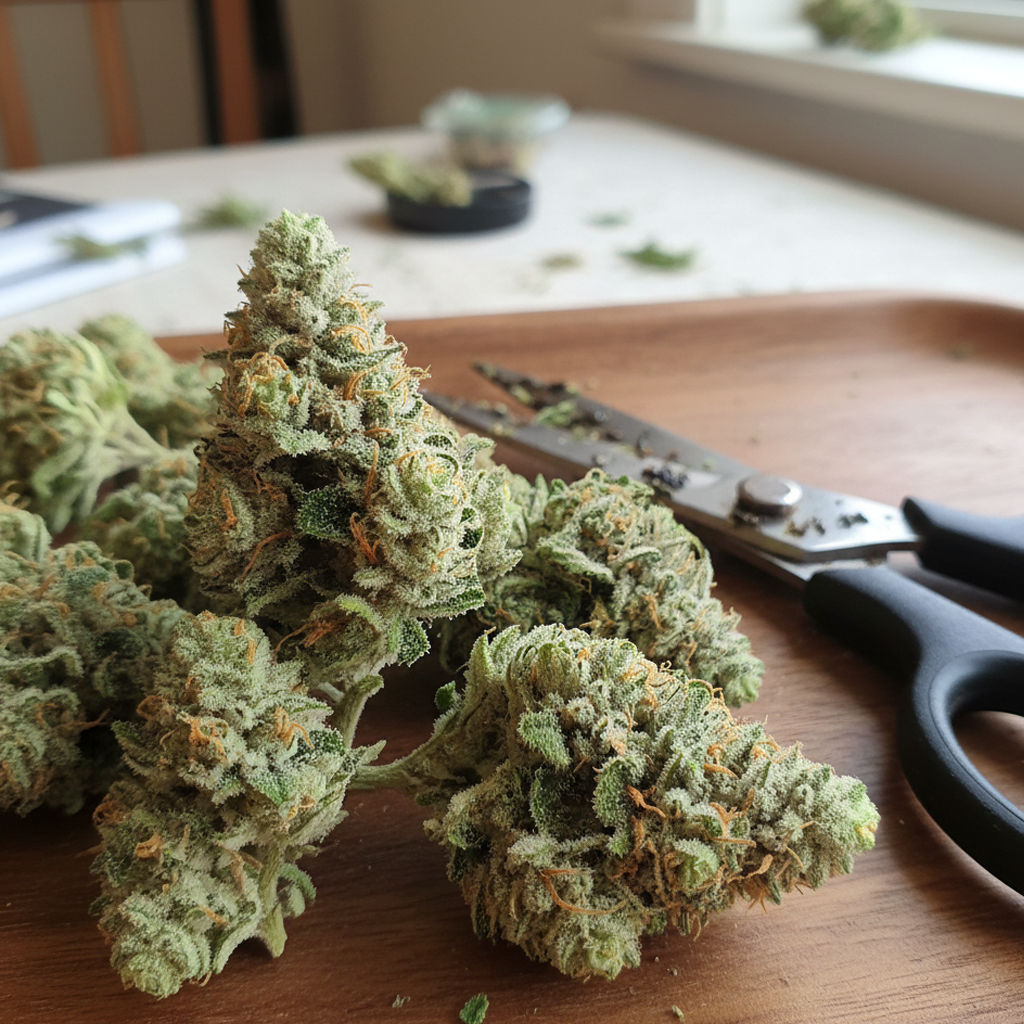 Harvest day was a sticky situation in the best way possible. My trimming scissors were glued shut with resin every ten minutes. The buds are dense, light green, and covered in bright orange hairs that contrast beautifully against the white frost.